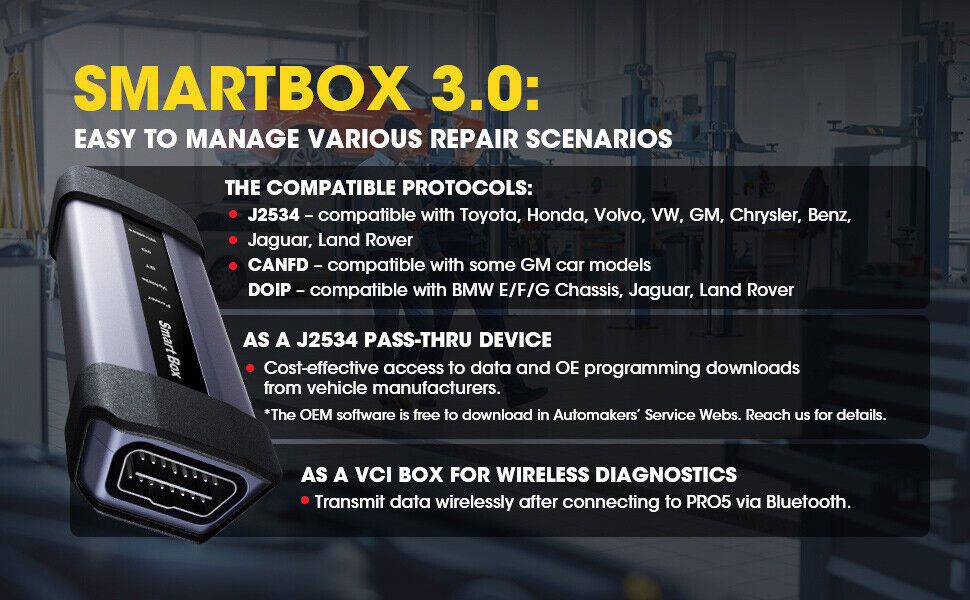 - Lançamento X431 SmartBox 3.0 – 1) Resolver os problemas da maioria dos veículos com ampla cobertura de veículos;atender às normas SAE para J2534-1 & -2, CANFD, DOIP e suportar DC9-36V para veículos HD;2) também serve como um VCI sem fio.